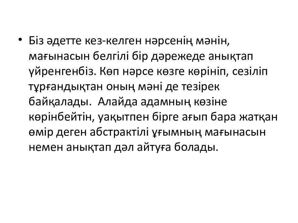 Біз әдетте кез-келген нәрсенің мәнін, мағынасын белгілі бір дәрежеде анықтап үйренгенбіз. Көп нәрсе көзге көрініп, сезіліп тұрғандықтан оның мәні де тезірек байқалады. Алайда адамның көзіне көрінбейтін, уақытпен бірге ағып бара жатқан өмір деген абстрактілі ұғымның мағынасын немен анықтап дәл айтуға болады.