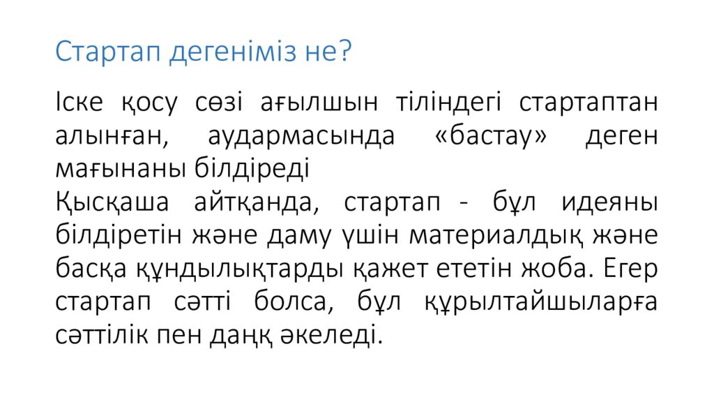 Іске қосу сөзі ағылшын тіліндегі стартаптан алынған, аудармасында « бастау » деген мағынаны білдіреді Қысқаша айтқанда, стартап - бұл идеяны білдіретін және даму үшін материалдық және басқа құндылықтарды қажет ететін жоба. Егер стартап сәтті болса, бұл құрылтайшыларға сәттілік пен даңқ әкеледі.