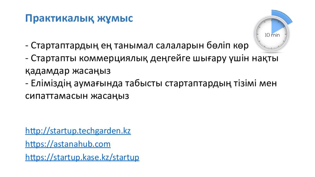 http://startup.techgarden.kz https://astanahub.com https://startup.kase.kz/startup Практикалық жұмыс - Стартаптардың ең танымал салаларын бөліп көрсетіңіз - Стартапты коммерциялық деңгейге шығару үшін нақты қадамдар жасаңыз - Еліміздің аумағында табысты стартаптардың тізімі мен сипаттамасын жасаңыз