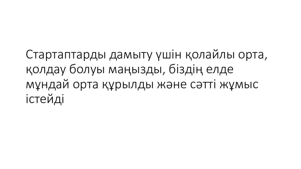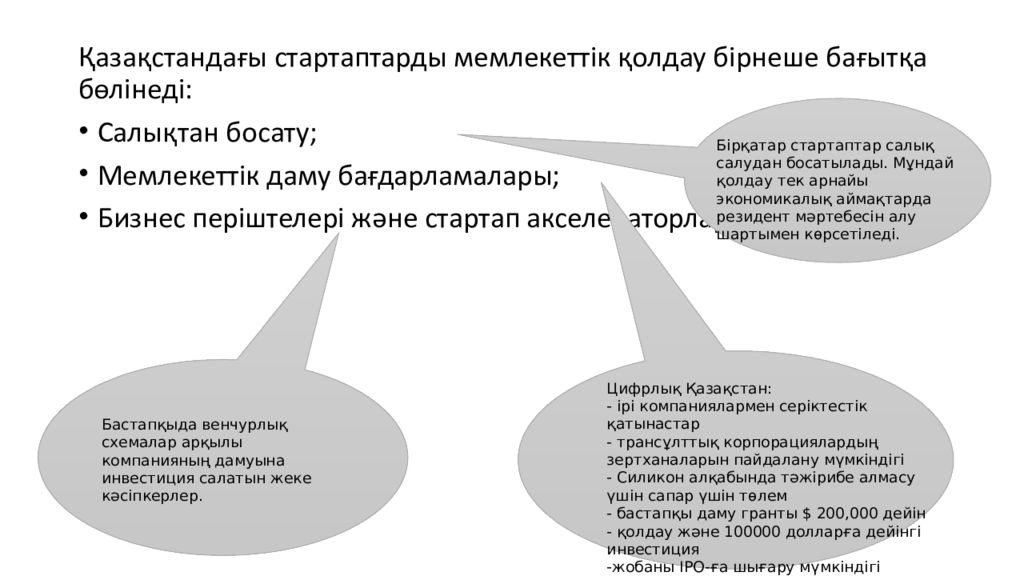 Қазақстандағы стартаптарды мемлекеттік қолдау бірнеше бағытқа бөлінеді : Салықтан босату ; Мемлекеттік даму бағдарламалары ; Бизнес періштелері және стартап акселераторлары. Бірқатар стартаптар салық салудан босатылады. Мұндай қолдау тек арнайы экономикалық аймақтарда резидент мәртебесін алу шартымен көрсетіледі. Цифрлық Қазақстан : - ірі компаниялармен серіктестік қатынастар - трансұлттық корпорациялардың зертханаларын пайдалану мүмкіндігі - Силикон алқабында тәжірибе алмасу үшін сапар үшін төлем - бастапқы даму гранты $ 200,000 дейін - қолдау және 100000 долларға дейінгі инвестиция - жобаны IPO- ға шығару мүмкіндігі Бастапқыда венчурлық схемалар арқылы компанияның дамуына инвестиция салатын жеке кәсіпкерлер.