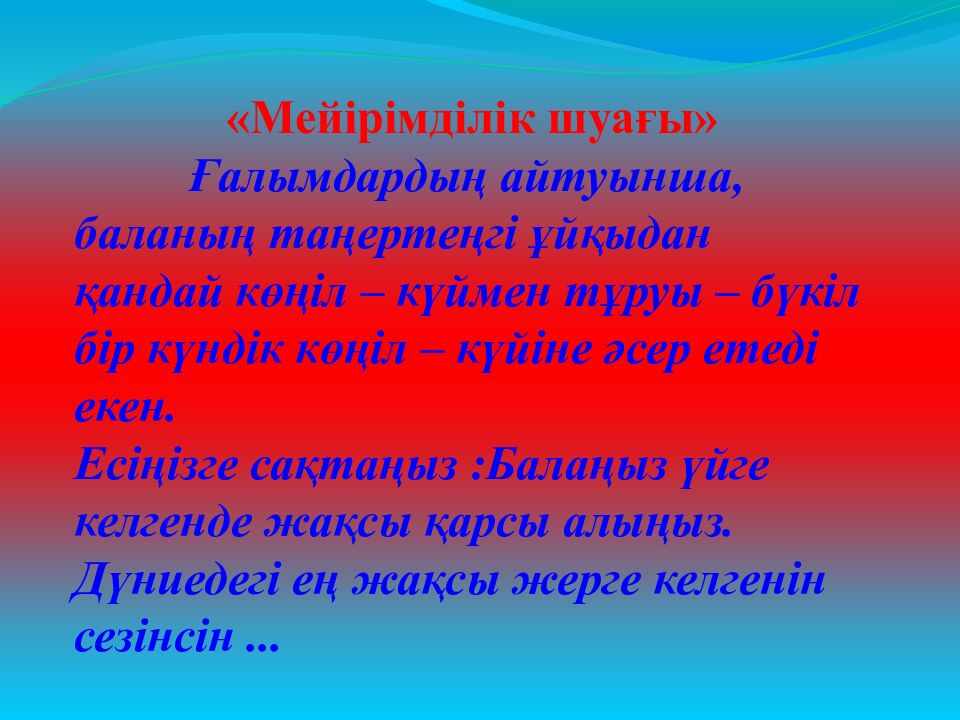 «Мейірімділік шуағы» Ғалымдардың айтуынша, баланың таңертеңгі ұйқыдан қандай көңіл – күймен тұруы – бүкіл бір күндік көңіл – күйіне әсер етеді екен. Есіңізге сақтаңыз :Балаңыз үйге келгенде жақсы қарсы алыңыз. Дүниедегі ең жақсы жерге келгенін сезінсін...