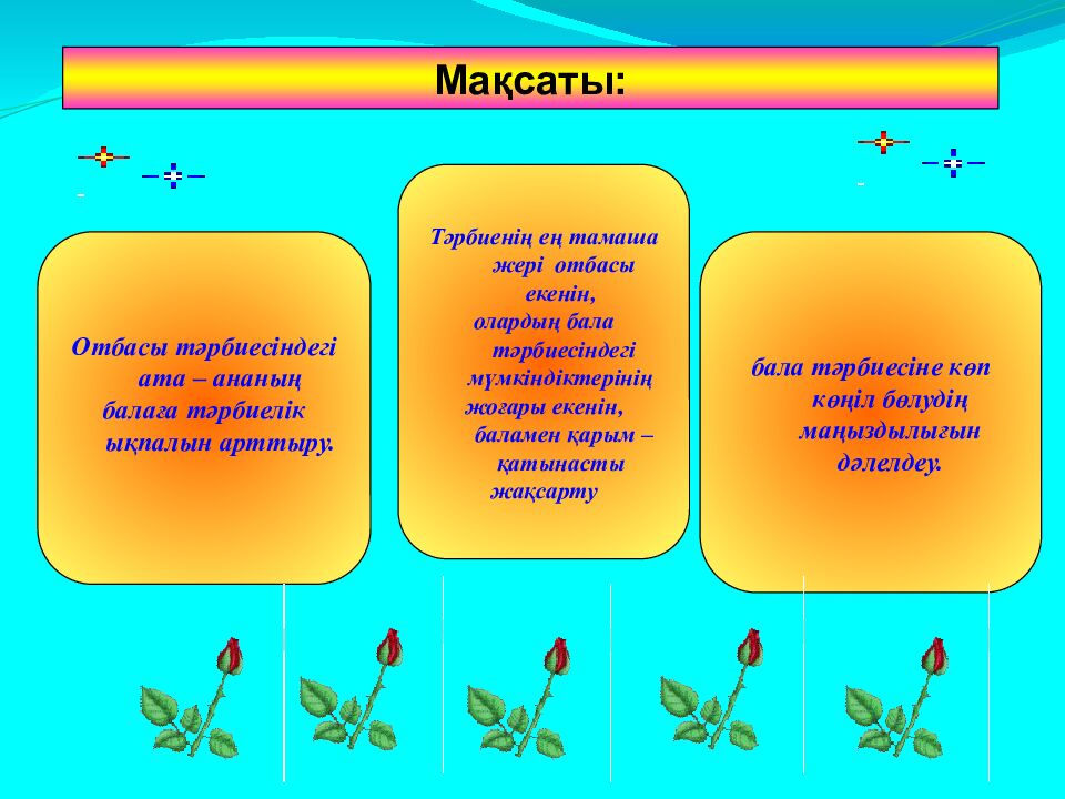 Мақсаты: Отбасы тәрбиесіндегі ата – ананың балаға тәрбиелік ықпалын арттыру. Тәрбиенің ең тамаша жері отбасы екенін, олардың бала тәрбиесіндегі мүмкіндіктерінің жоғары екенін, баламен қарым – қатынасты жақсарту бала тәрбиесіне көп көңіл бөлудің маңыздылығын дәлелдеу.