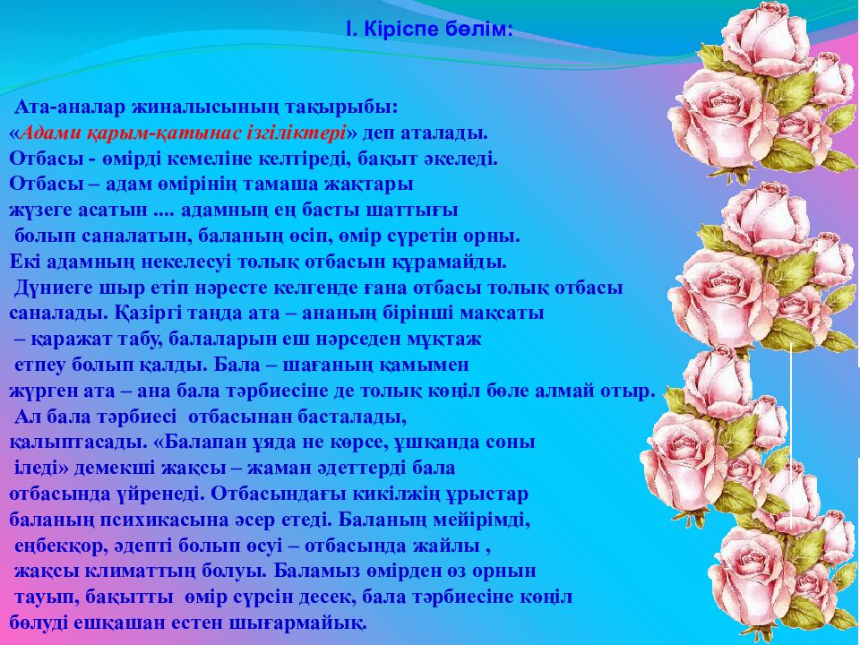 І. Кіріспе бөлім : Ата-аналар жиналысының тақырыбы : « Адами қарым-қатынас ізгіліктері » деп аталады. Отбасы - өмірді кемеліне келтіреді, бақыт әкеледі. Отбасы – адам өмірінің тамаша жақтары жүзеге асатын.... адамның ең басты шаттығы болып саналатын, баланың өсіп, өмір сүретін орны. Екі адамның некелесуі толық отбасын құрамайды. Дүниеге шыр етіп нәресте келгенде ғана отбасы толық отбасы саналады. Қазіргі таңда ата – ананың бірінші мақсаты – қаражат табу, балаларын еш нәрседен мұқтаж етпеу болып қалды. Бала – шағаның қамымен жүрген ата – ана бала тәрбиесіне де толық көңіл бөле алмай отыр. Ал бала тәрбиесі отбасынан басталады, қалыптасады. « Балапан ұяда не көрсе, ұшқанда соны іледі » демекші жақсы – жаман әдеттерді бала отбасында үйренеді. Отбасындағы кикілжің ұрыстар баланың психикасына әсер етеді. Баланың мейірімді, еңбекқор, әдепті болып өсуі – отбасында жайлы, жақсы климаттың болуы. Баламыз өмірден өз орнын тауып, бақытты өмір сүрсін десек, бала тәрбиесіне көңіл бөлуді ешқашан естен шығармайық.