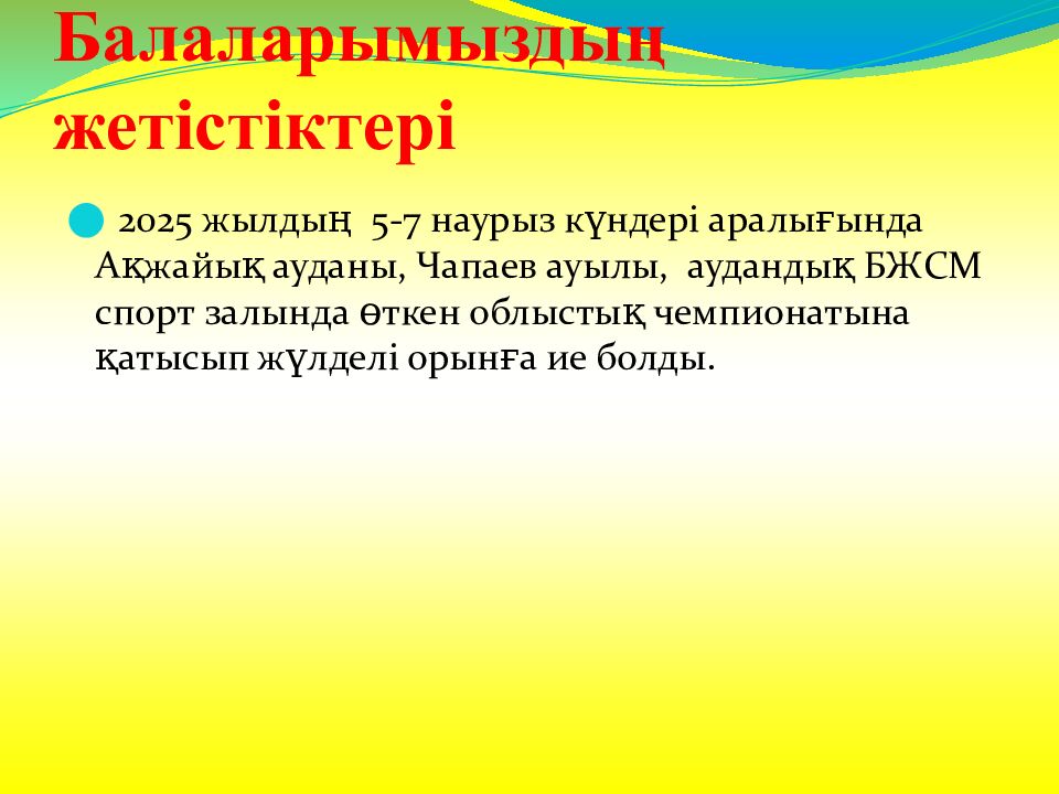 2025 жылдың 5-7 наурыз күндері аралығында Ақжайық ауданы, Чапаев ауылы, аудандық БЖСМ спорт залында өткен облыстық чемпионатына қатысып жүлделі орын ға ие болды.