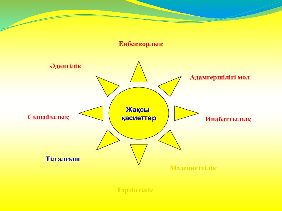 Жақсы қасиеттер Әдептілік Тәртіптілік Мәдениеттілік Инабаттылық Адамгершілігі мол Еңбекқорлық Тіл алғыш Сыпайылық