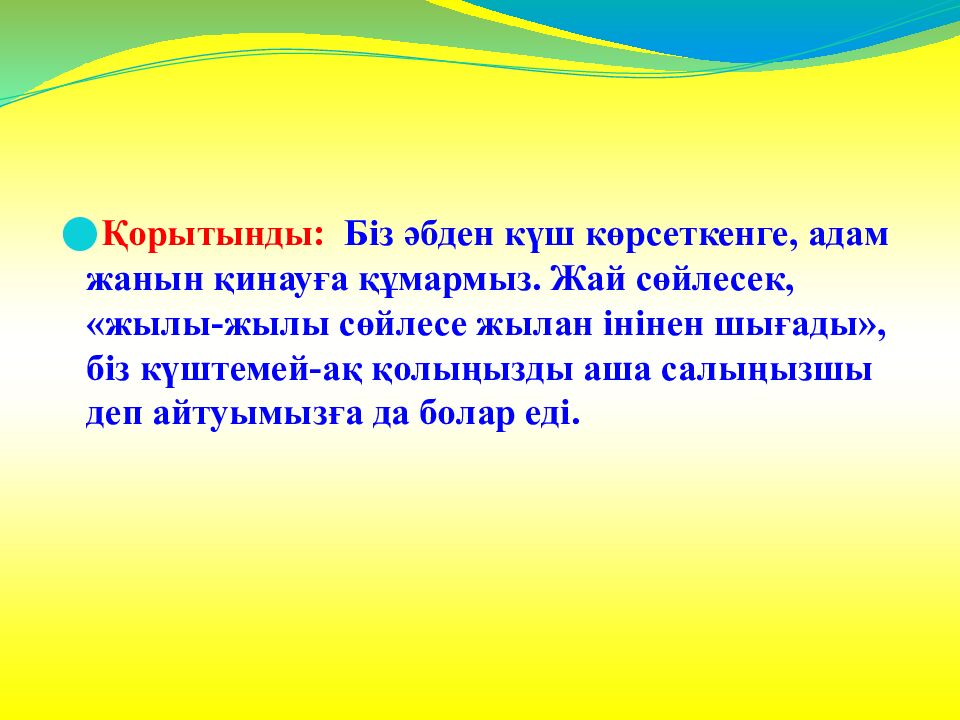 Қорытынды: Біз әбден күш көрсеткенге, адам жанын қинауға құмармыз. Жай сөйлесек, «жылы-жылы сөйлесе жылан інінен шығады», біз күштемей-ақ қолыңызды аша салыңызшы деп айтуымызға да болар еді.