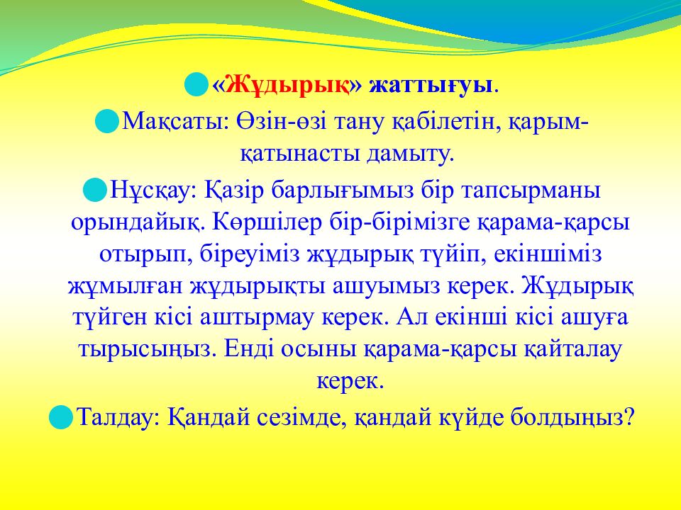 « Жұдырық » жаттығуы. Мақсаты: Өзін-өзі тану қабілетін, қарым-қатынасты дамыту. Нұсқау: Қазір барлығымыз бір тапсырманы орындайық. Көршілер бір-бірімізге қарама-қарсы отырып, біреуіміз жұдырық түйіп, екіншіміз жұмылған жұдырықты ашуымыз керек. Жұдырық түйген кісі аштырмау керек. Ал екінші кісі ашуға тырысыңыз. Енді осыны қарама-қарсы қайталау керек. Талдау: Қандай сезімде, қандай күйде болдыңыз?