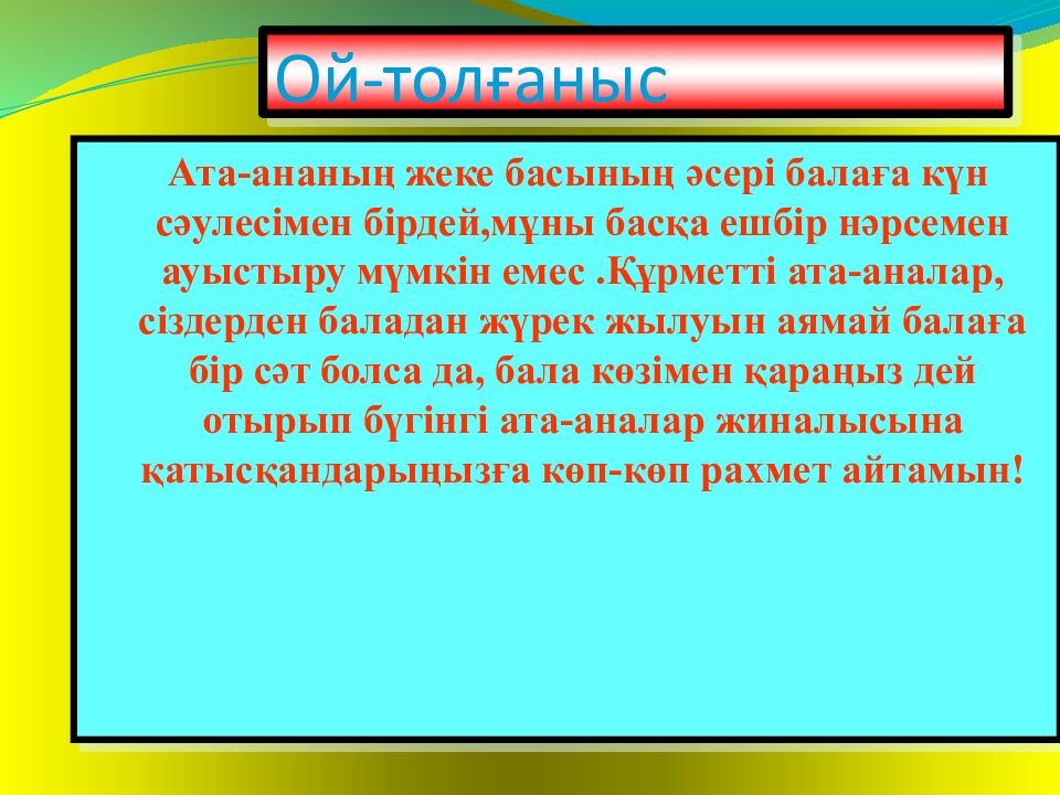 Ата-ананың жеке басының әсері балаға күн сәулесімен бірдей,мұны басқа ешбір нәрсемен ауыстыру мүмкін емес. Құрметті ата-аналар, сіздерден баладан жүрек жылуын аямай балаға бір сәт болса да, бала көзімен қараңыз дей отырып бүгінгі ата-аналар жиналысына қатысқандарыңызға көп-көп рахмет айтамын ! Ой-толғаныс