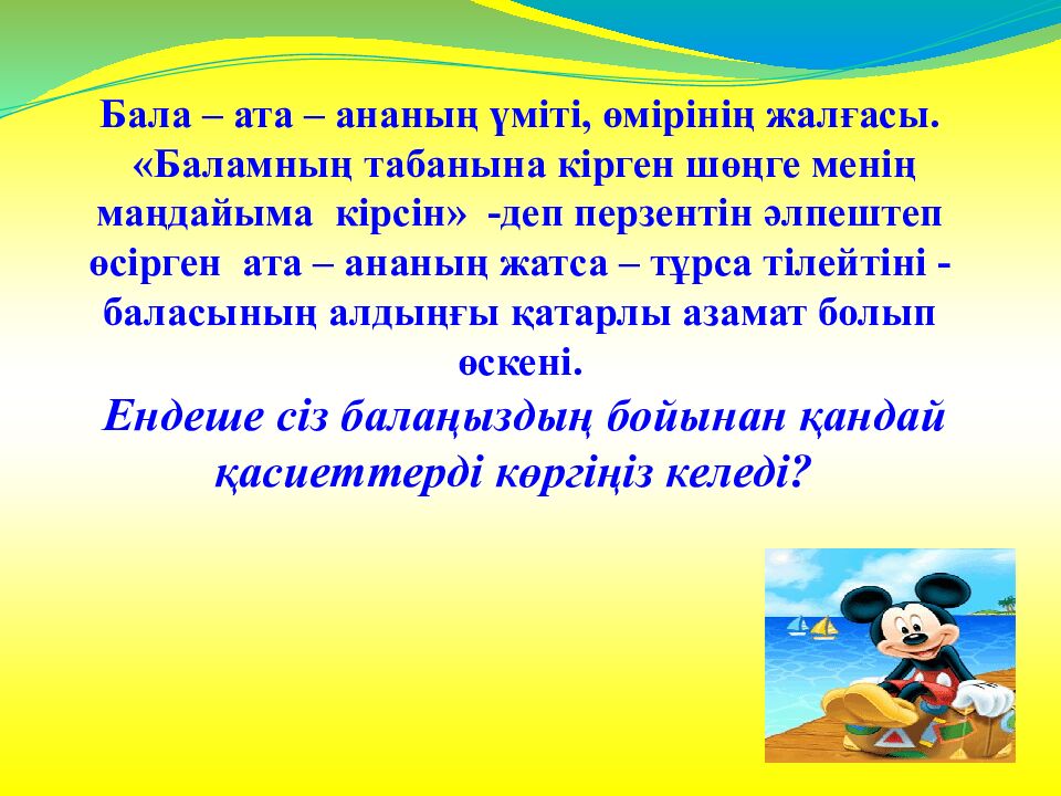 Бала – ата – ананың үміті, өмірінің жалғасы. «Баламның табанына кірген шөңге менің маңдайыма кірсін» -деп перзентін әлпештеп өсірген ата – ананың жатса – тұрса тілейтіні -баласының алдыңғы қатарлы азамат болып өскені. Ендеше сіз балаңыздың бойынан қандай қасиеттерді көргіңіз келеді?