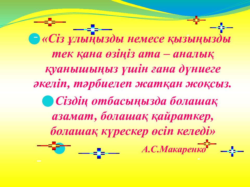 «Сіз ұлыңызды немесе қызыңызды тек қана өзіңіз ата – аналық қуанышыңыз үшін ғана дүниеге әкеліп, тәрбиелеп жатқан жоқсыз. Сіздің отбасыңызда болашақ азамат, болашақ қайраткер, болашақ күрескер өсіп келеді» А.С.Макаренко