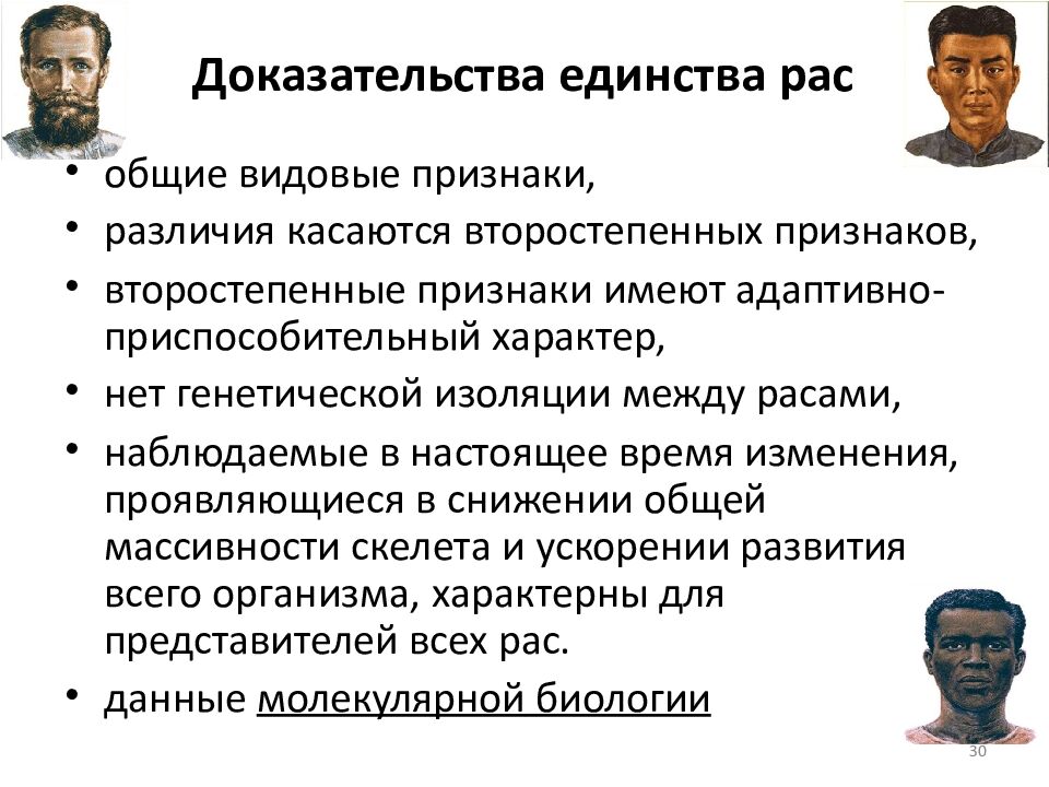 общие видовые признаки, различия касаются второстепенных признаков, второстепенные признаки имеют адаптивно- приспособительный характер, нет генетической изоляции между расами, наблюдаемые в настоящее время изменения, проявляющиеся в снижении общей массивности скелета и ускорении развития всего организма, характерны для представителей всех рас. данные молекулярной биологии 30