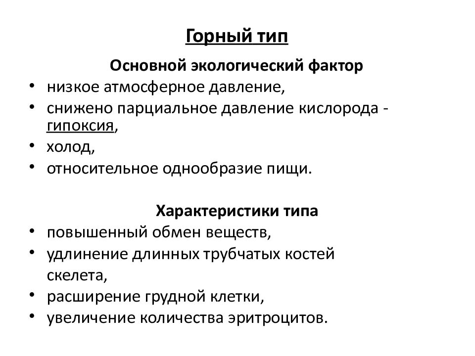 Основной экологический фактор низкое атмосферное давление, снижено парциальное давление кислорода - гипоксия, холод, относительное однообразие пищи. Характеристики типа повышенный обмен веществ, удлинение длинных трубчатых костей скелета, расширение грудной клетки, увеличение количества эритроцитов.