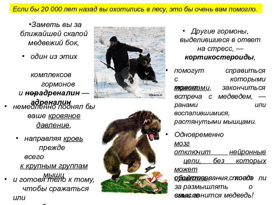Заметь вы за ближайшей скалой медвежий бок, один из этих комплексов гормонов — адреналин и норадреналин — немедленно поднял бы ваше кровяное давление, направляя кровь прежде всего к крупным группам мышц и готовя тело к тому, чтобы сражаться или убегать. Другие гормоны, выделившиеся в ответ на стресс, — кортикостероиды, помогут с травмами, справиться которыми закончиться с медведем, — может встреча ранами или воспалившимися, растянутыми мышцами. Одновременно мозг отключит нейронные цепи, без которых может обойтись, — стоит ли размышлять о смысле существования, когда за вами гонится медведь! Если бы 20 000 лет назад вы охотились в лесу, это бы очень вам помогло.