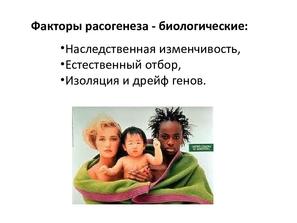 Факторы расогенеза - биологические: Наследственная изменчивость, Естественный отбор, Изоляция и дрейф генов.