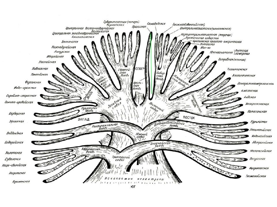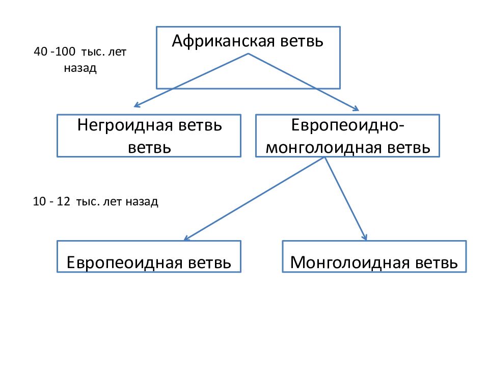 Негроидная ветвь ветвь Европеоидно- монголоидная ветвь 40 - 100 тыс. лет назад Европеоидная ветвь Монголоидная ветвь 10 - 12 тыс. лет назад