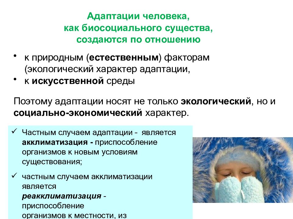 к природным ( естественным ) факторам (экологический характер адаптации, к искусственной среды Поэтому адаптации носят не только экологический, но и социально- экономический характер. Адаптации человека, как биосоциального существа, создаются по отношению Частным случаем адаптации – является акклиматизация - приспособление организмов к новым условиям существования; частным случаем акклиматизации является реакклиматизация - приспособление организмов к местности, из которой они по каким- либо причинам исчезли.