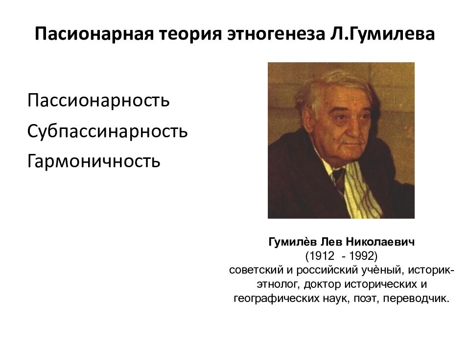 Пассионарность Субпассинарность Гармоничность Гумилѐв Лев Николаевич (1912 - 1992) советский и российский учѐный, историк- этнолог, доктор исторических и географических наук, поэт, переводчик.