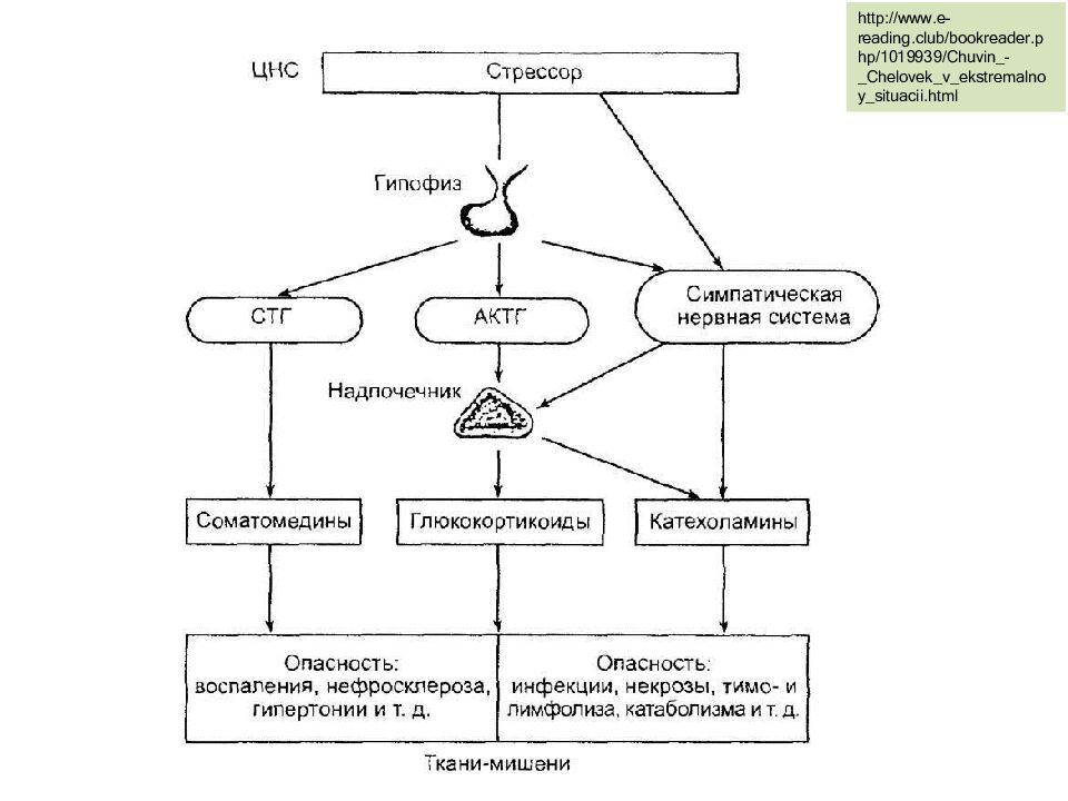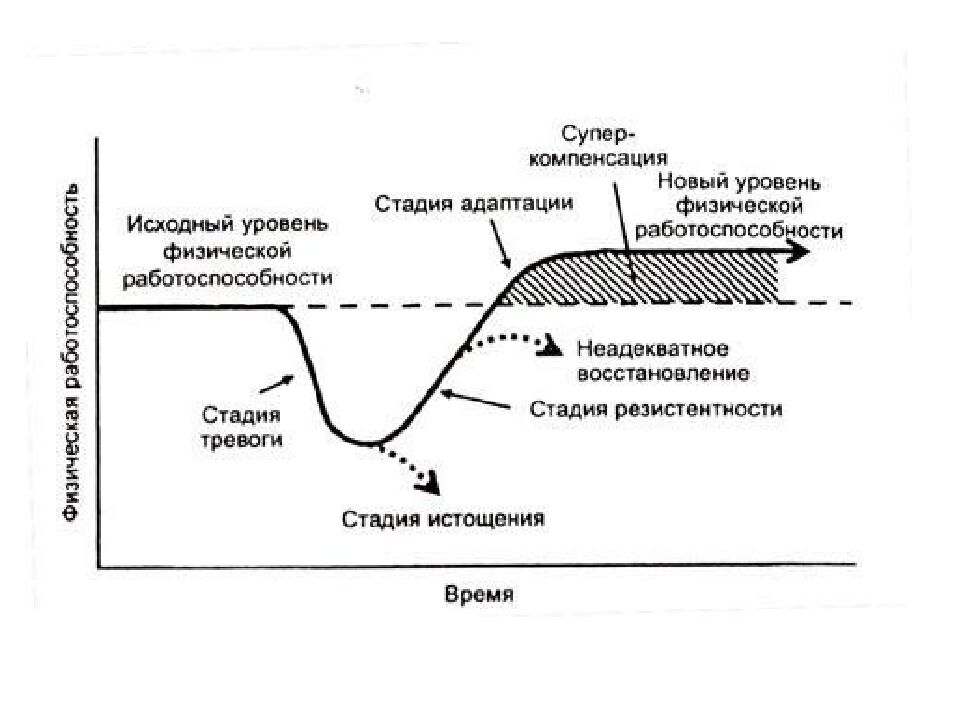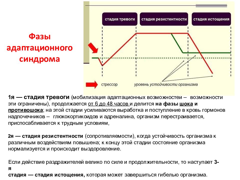 я — стадия тревоги (мобилизация адаптационных возможностей — возможности эти ограничены), продолжается от 6 до 48 часов и делится на фазы шока и противошока ; на этой стадии усиливаются выработка и поступление в кровь гормонов надпочечников — глюкокортикоидов и адреналина, организм перестраивается, приспосабливается к трудным условиям, я — стадия резистентности (сопротивляемости), когда устойчивость организма к различным воздействиям повышена; к концу этой стадии состояние организма нормализуется и происходит выздоровление. Если действие раздражителей велико по силе и продолжительности, то наступает 3- я стадия — стадия истощения, которая может завершиться гибелью организма.