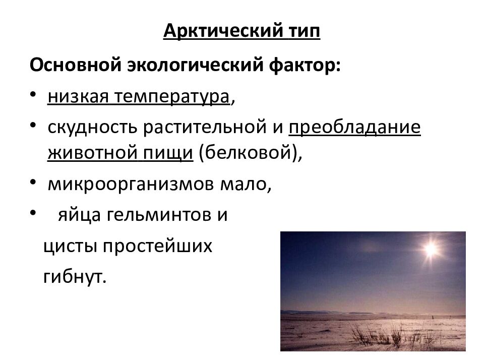 Арктический тип Основной экологический фактор: низкая температура, скудность растительной и преобладание животной пищи (белковой), микроорганизмов мало, яйца гельминтов и цисты простейших гибнут.