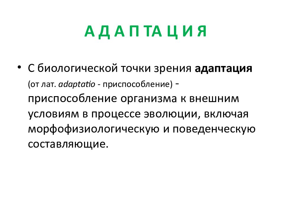 С биологической точки зрения адаптация (от лат. adaptatio - приспособление) - приспособление организма к внешним условиям в процессе эволюции, включая морфофизиологическую и поведенческую составляющие.