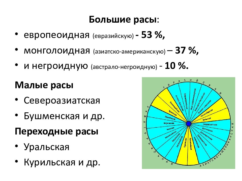 Большие расы : европеоидная (евразийскую) - 53 %, монголоидная (азиатско- американскую) – 37 %, и негроидную (австрало- негроидную) - 10 %. Малые расы Североазиатская Бушменская и др. Переходные расы Уральская Курильская и др.
