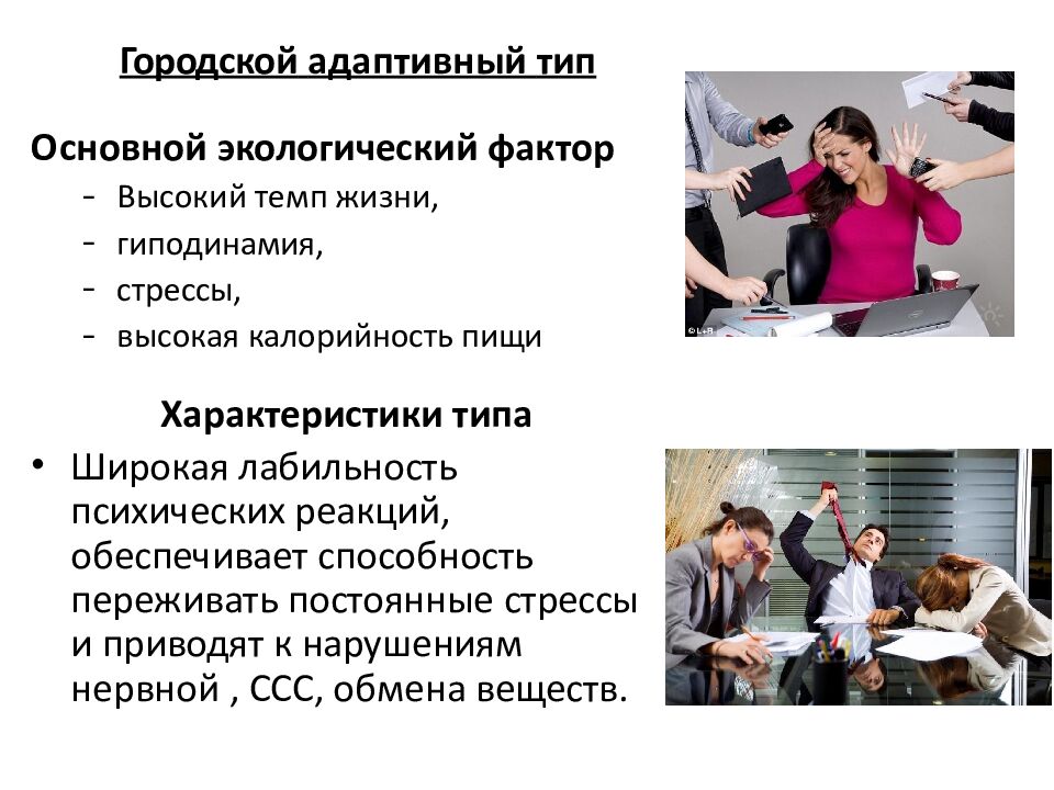 Основной экологический фактор Высокий темп жизни, гиподинамия, стрессы, высокая калорийность пищи Характеристики типа Широкая лабильность психических реакций, обеспечивает способность переживать постоянные стрессы и приводят к нарушениям нервной, ССС, обмена веществ.