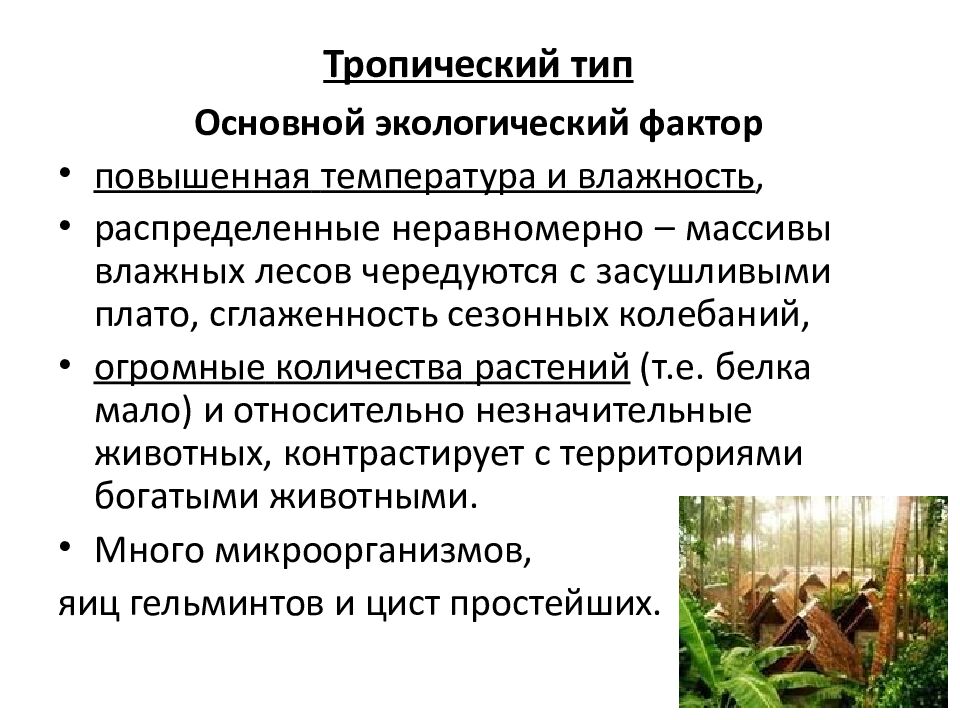 Основной экологический фактор повышенная температура и влажность, распределенные неравномерно – массивы влажных лесов чередуются с засушливыми плато, сглаженность сезонных колебаний, огромные количества растений (т.е. белка мало) и относительно незначительные животных, контрастирует с территориями богатыми животными. Много микроорганизмов, яиц гельминтов и цист простейших.