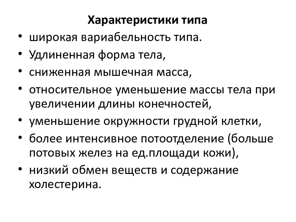 Характеристики типа широкая вариабельность типа. Удлиненная форма тела, сниженная мышечная масса, относительное уменьшение массы тела при увеличении длины конечностей, уменьшение окружности грудной клетки, более интенсивное потоотделение (больше потовых желез на ед.площади кожи), низкий обмен веществ и содержание холестерина.