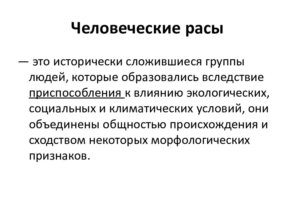 — это исторически сложившиеся группы людей, которые образовались вследствие приспособления к влиянию экологических, социальных и климатических условий, они объединены общностью происхождения и сходством некоторых морфологических признаков.