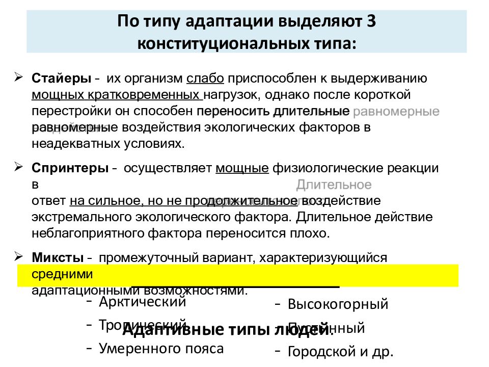 По типу адаптации выделяют 3 конституциональных типа: Арктический Тропический Умеренного пояса Высокогорный Пустынный Городской и др. Стайеры – их организм слабо приспособлен к выдерживанию мощных кратковременных нагрузок, однако после короткой перестройки он способен переносить длительные равномерные воздействия экологических факторов в неадекватных условиях. Спринтеры – осуществляет мощные физиологические реакции в ответ на сильное, но не продолжительное воздействие экстремального экологического фактора. Длительное действие неблагоприятного фактора переносится плохо. Миксты – промежуточный вариант, характеризующийся средними адаптационными возможностями. Адаптивные типы людей.