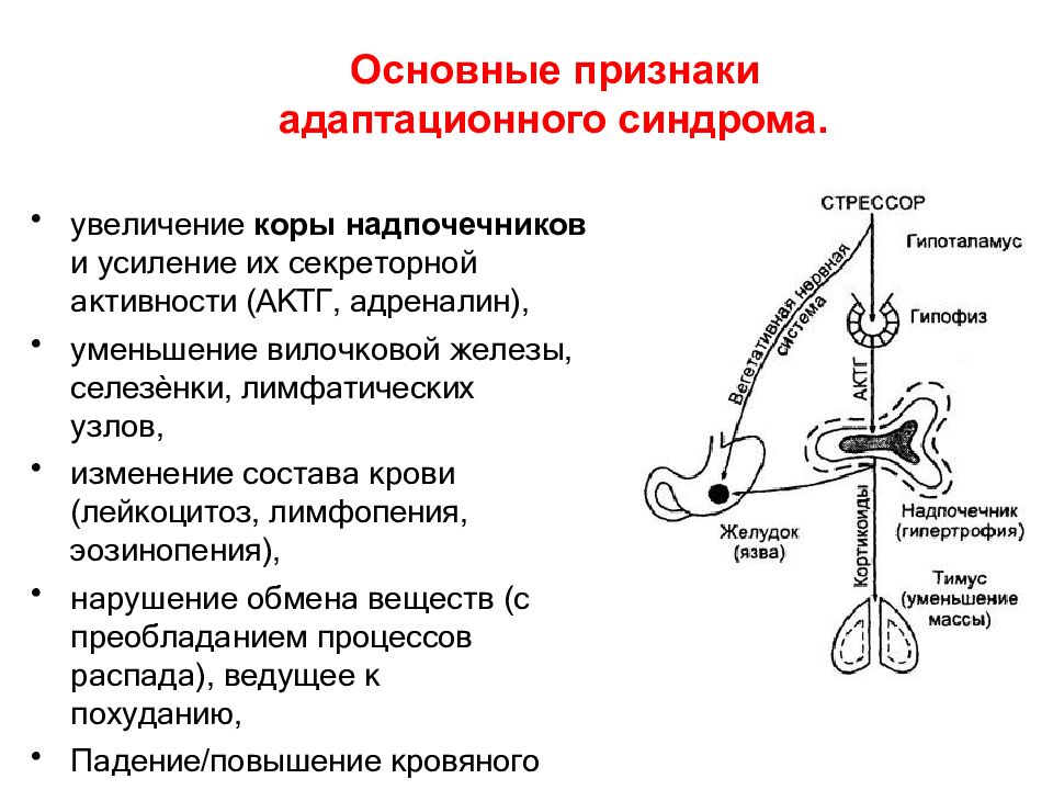 увеличение коры надпочечников и усиление их секреторной активности (АКТГ, адреналин), уменьшение вилочковой железы, селезѐнки, лимфатических узлов, изменение состава крови (лейкоцитоз, лимфопения, эозинопения), нарушение обмена веществ (с преобладанием процессов распада), ведущее к похуданию, Падение/повышение кровяного давления и др. Основные признаки адаптационного синдрома.