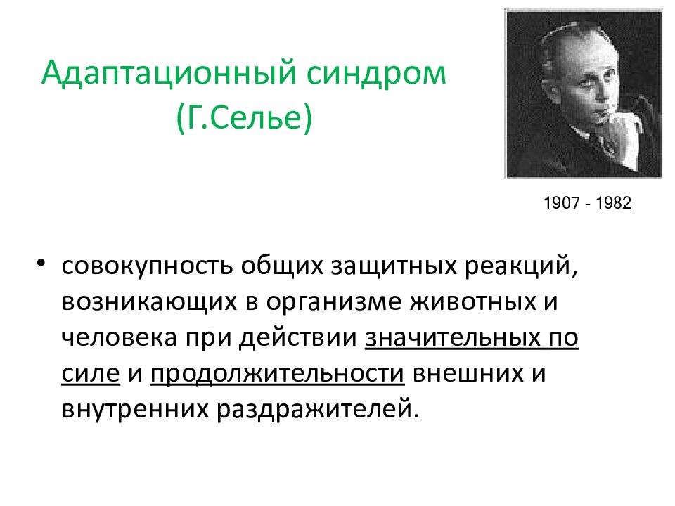 совокупность общих защитных реакций, возникающих в организме животных и человека при действии значительных по силе и продолжительности внешних и внутренних раздражителей. 1907 - 1982