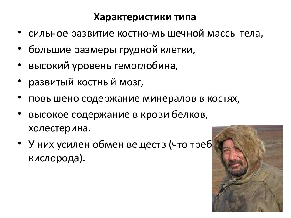 Характеристики типа сильное развитие костно- мышечной массы тела, большие размеры грудной клетки, высокий уровень гемоглобина, развитый костный мозг, повышено содержание минералов в костях, высокое содержание в крови белков, холестерина. У них усилен обмен веществ (что требует больше кислорода).