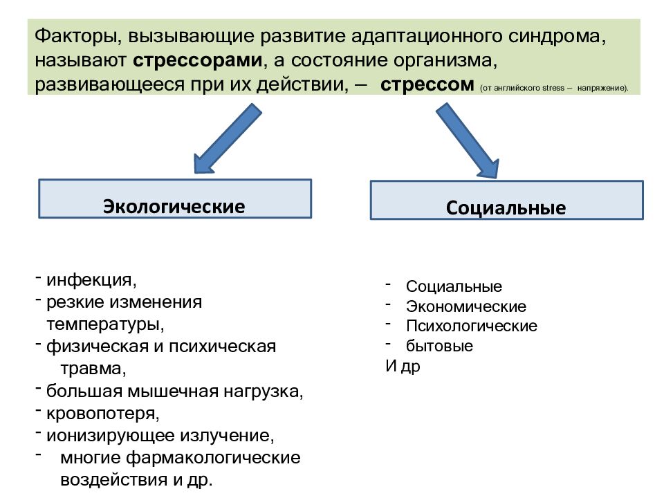инфекция, резкие изменения температуры, физическая и психическая травма, большая мышечная нагрузка, кровопотеря, ионизирующее излучение, многие фармакологические воздействия и др. Факторы, вызывающие развитие адаптационного синдрома, называют стрессорами, а состояние организма, развивающееся при их действии, — стрессом (от английского stress — напряжение). Экологические Социальные Социальные Экономические Психологические бытовые И др