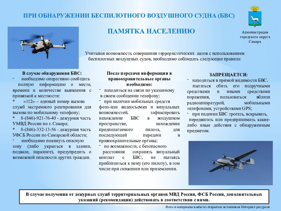 Администрация городского округа Самара ПРИ ОБНАРУЖЕНИИ БЕСПИЛОТНОГО ВОЗДУШНОГО СУДНА (БВС) ПАМЯТКА НАСЕЛЕНИЮ Учитывая возможность совершения террористических актов с использованием беспилотных воздушных судов, необходимо соблюдать следующие правила: В случае обнаружения БВС: необходимо оперативно сообщить полную информацию о месте, времени и количестве выявления с привязкой к местности: * « 112» – единый номер вызова служб экстренного реагирования для вызова по мобильному телефону; * 8-(846)-921-76-40 - дежурная часть УМВД России по г. Самара; * 8-(846)-332-13-56 - дежурная часть УФСБ России по Самарской области; необходимо покинуть опасную зону (либо укрыться в здании, подвале, паркинге), предупредить о возможной опасности других граждан. После передачи информации в правоохранительные органы необходимо: н аходиться на связи по указанному в своем сообщении телефону; при наличии мобильных средств фото-или видеосъемки и визуальных возможностей, зафиксировать нахождение БВС в воздушном пространстве, нахождение предполагаемого пилота, для последующей передачи в правоохранительные органы; по возможности, с безопасного расстояния сохранять визуальный контакт с БВС, не пытаясь приблизиться к нему (его пилоту), в том числе при снижении или приземлении. ЗАПРЕЩАЕТСЯ: находиться в прямой видимости БВС, пытаться сбить его подручными средствами и иными средствами поражения, пользоваться вблизи радиоаппаратурой, мобильными телефонами, устройствами GPS ; при падении БВС трогать, вскрывать, передвигать или предпринимать какие-либо иные действия с обнаруженным предметом. В случае получения от дежурных служб территориальных органов МВД России, ФСБ России, дополнительных указаний (рекомендации) действовать в соответствии с ними. Фото и материалы взяты из открытых источников Интернет-ресурсов