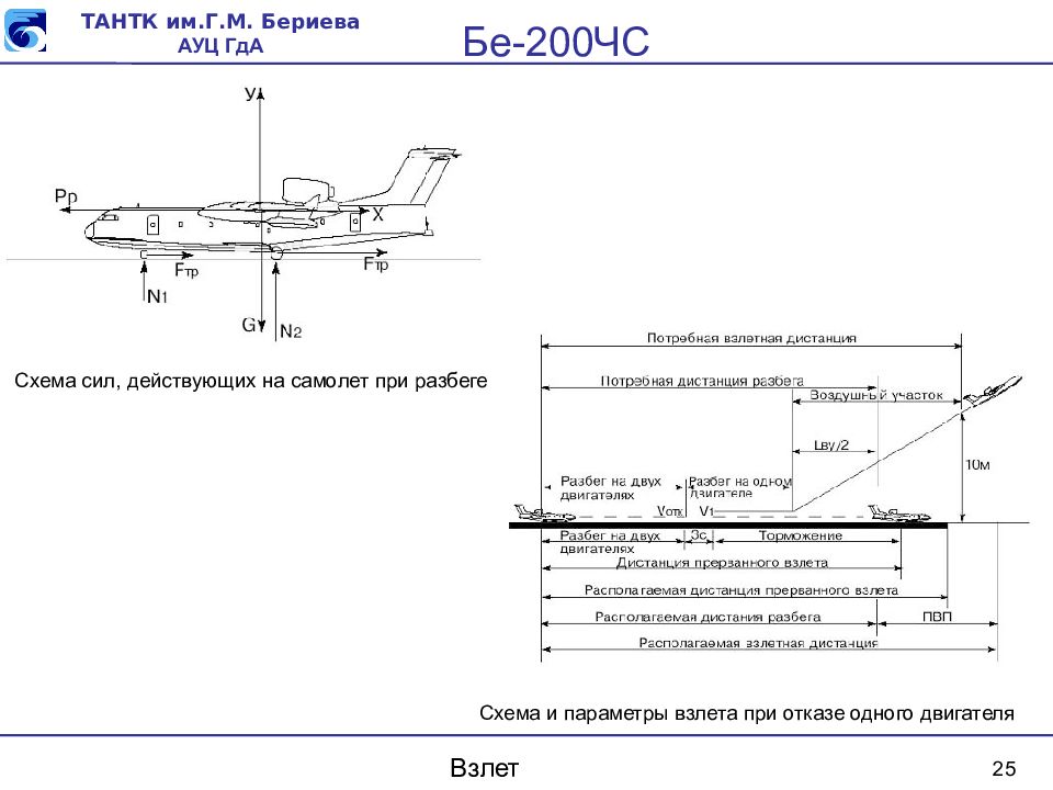 25 Взлет Схема сил, действующих на самолет при разбеге Схема и параметры взлета при отказе одного двигателя
