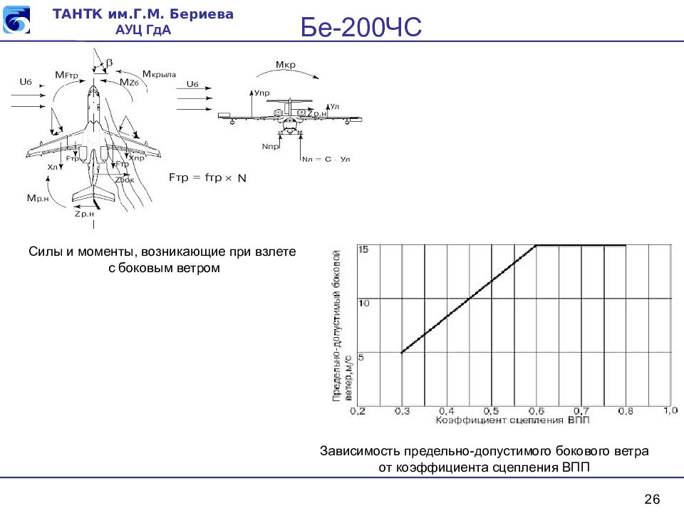 26 Силы и моменты, возникающие при взлете с боковым ветром Зависимость предельно-допустимого бокового ветра от коэффициента сцепления ВПП