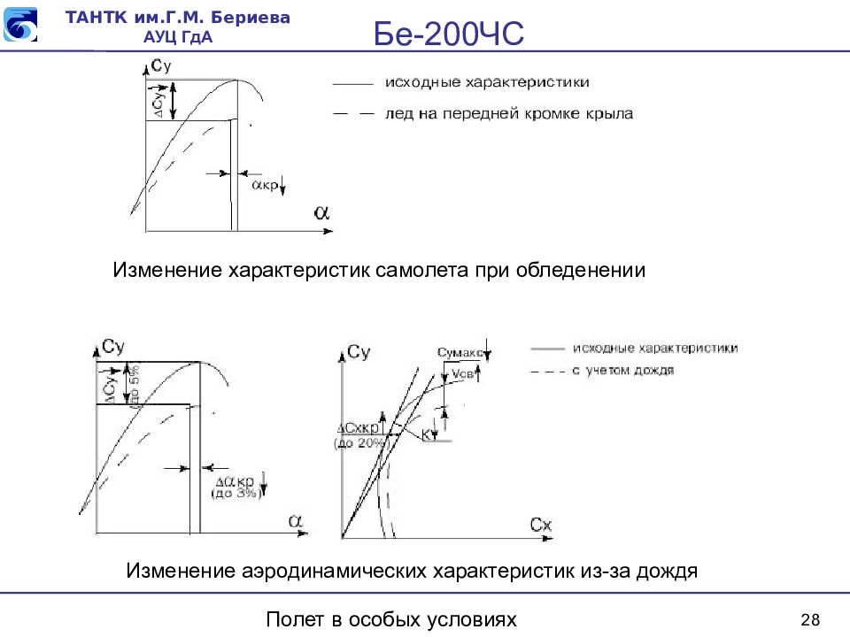 28 Полет в особых условиях Изменение характеристик самолета при обледенении Изменение аэродинамических характеристик из-за дождя