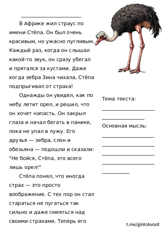 ________________________ В Африке жил страус по имени Стёпа. Он был очень красивым, но ужасно пугливым. Каждый раз, когда он слышал какой-то звук, он сразу убегал и прятался за кустами. Даже когда зебра Зина чихала, Стёпа подпрыгивал от страха! Однажды он увидел, как по небу летит орел, и решил, что он хочет напасть. Он закрыл глаза и начал бегать в панике, пока не упал в лужу. Его друзья — зебра, слон и обезьяна — подошли и сказали: "Не бойся, Стёпа, это всего лишь орел!" Стёпа понял, что иногда страх — это просто воображение. С тех пор он стал стараться не пугаться так сильно и даже смеяться над своими страхами. Теперь его друзья называли его смелым Стёпой, и он был счастлив! Тема текста: ______________________________________ Основная мысль: _______________________________________________________________________________________________ t.me/ glotokvozd