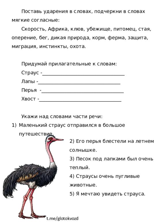 t.me/ glotokvozd Поставь ударения в словах, подчеркни в словах мягкие согласные: Скорость, Африка, клюв, убежище, питомец, стая, оперение, бег, дикая природа, корм, ферма, защита, миграция, инстинкты, охота. Придумай прилагательные к словам: Страус -__________________________________ Лапы -__________________________________ Перья -__________________________________ Хвост -__________________________________ Укажи над словами части речи: Маленький страус отправился в большое путешествие. 2) Его перья блестели на летнем солнышке. 3) Песок под лапками был очень теплый. 4) Страусы очень пугливые животные. 5) Я мечтаю увидеть страуса.