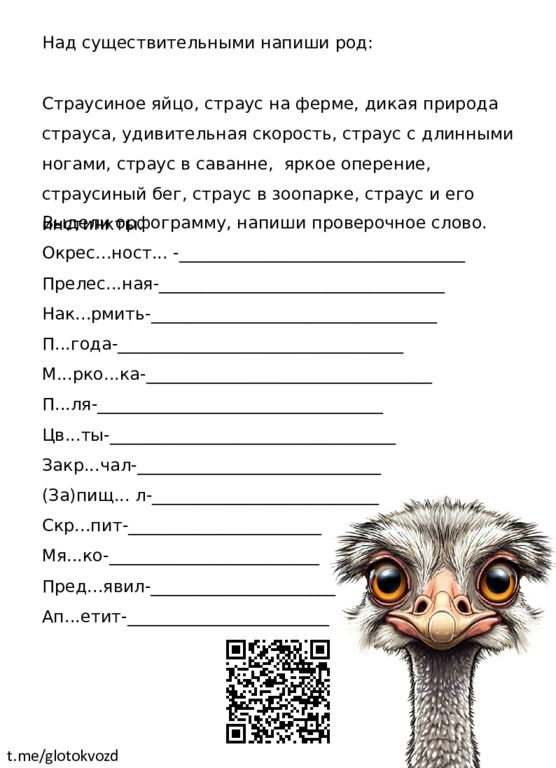 t.me/ glotokvozd Над существительными напиши род: Страусиное яйцо, страус на ферме, дикая природа страуса, у дивительная скорость, страус с длинными ногами, страус в саванне, яркое оперение, с траусиный бег, страус в зоопарке, страус и его инстинкты. Выдели орфограмму, напиши проверочное слово. Окрес... ност... -__________________________________ П релес... ная -__________________________________ Н ак... рмить -__________________________________ П...года -__________________________________ М... рко...ка -__________________________________ П...ля -__________________________________ Ц в...ты -__________________________________ З акр...чал -_____________________________ (За) пищ... л -___________________________ С кр...пит -_______________________ М я...ко -_________________________ П ред...явил -______________________ Ап... етит -________________________