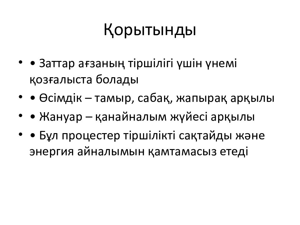 • Заттар ағзаның тіршілігі үшін үнемі қозғалыста болады • Өсімдік – тамыр, сабақ, жапырақ арқылы • Жануар – қанайналым жүйесі арқылы • Бұл процестер тіршілікті сақтайды және энергия айналымын қамтамасыз етеді