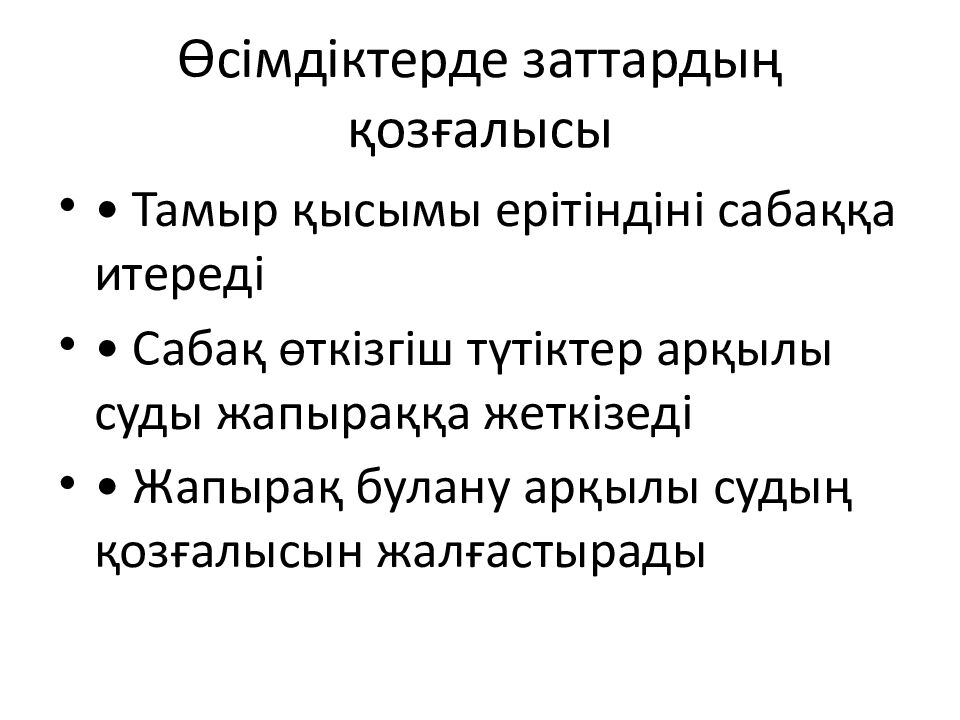 • Тамыр қысымы ерітіндіні сабаққа итереді • Сабақ өткізгіш түтіктер арқылы суды жапыраққа жеткізеді • Жапырақ булану арқылы судың қозғалысын жалғастырады