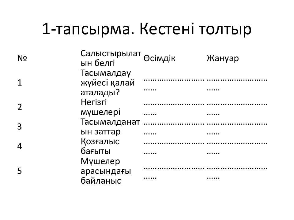 Слайд 10: 1- тапсырма. Кестені толтыр