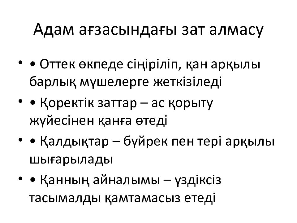 • Оттек өкпеде сіңіріліп, қан арқылы барлық мүшелерге жеткізіледі • Қоректік заттар – ас қорыту жүйесінен қанға өтеді • Қалдықтар – бүйрек пен тері арқылы шығарылады • Қанның айналымы – үздіксіз тасымалды қамтамасыз етеді