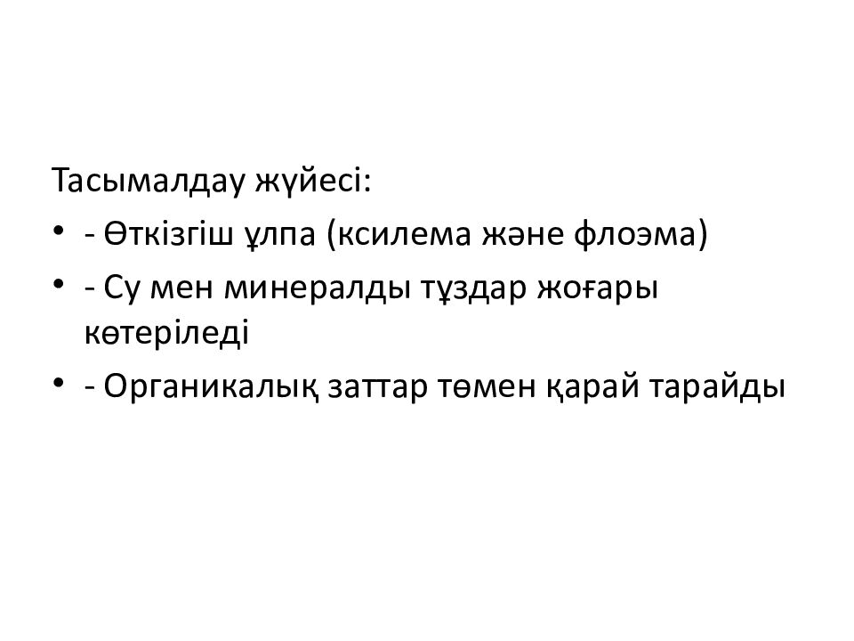 Тасымалдау жүйесі: - Өткізгіш ұлпа (ксилема және флоэма) - Су мен минералды тұздар жоғары көтеріледі - Органикалық заттар төмен қарай тарайды