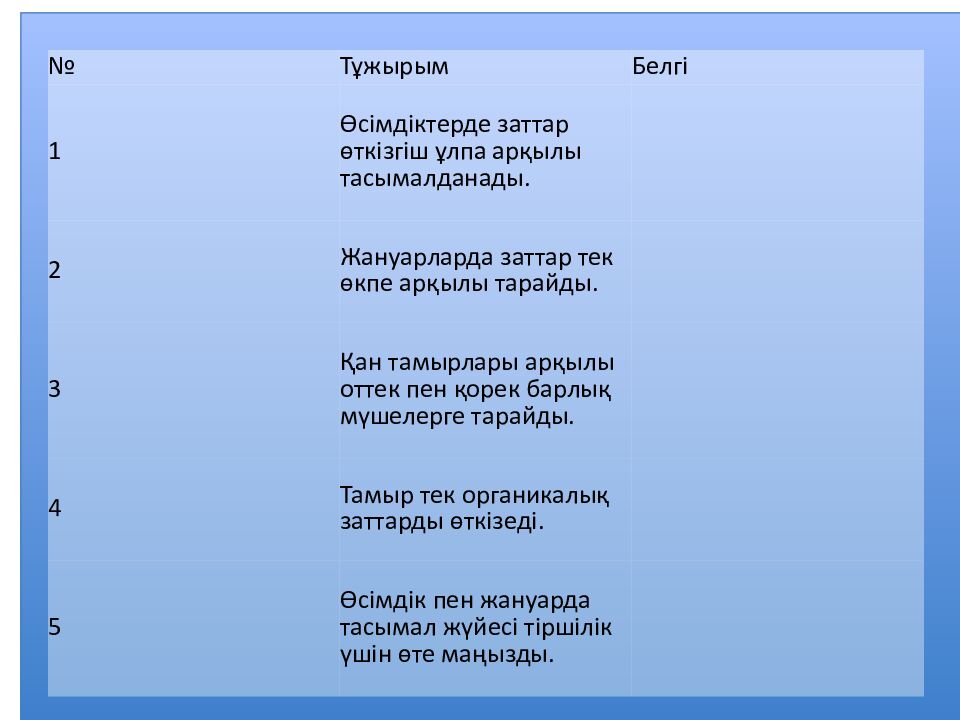 № Тұжырым Белгі 1 Өсімдіктерде заттар өткізгіш ұлпа арқылы тасымалданады. 2 Жануарларда заттар тек өкпе арқылы тарайды. 3 Қан тамырлары арқылы оттек пен қорек барлық мүшелерге тарайды. 4 Тамыр тек органикалық заттарды өткізеді. 5 Өсімдік пен жануарда тасымал жүйесі тіршілік үшін өте маңызды.