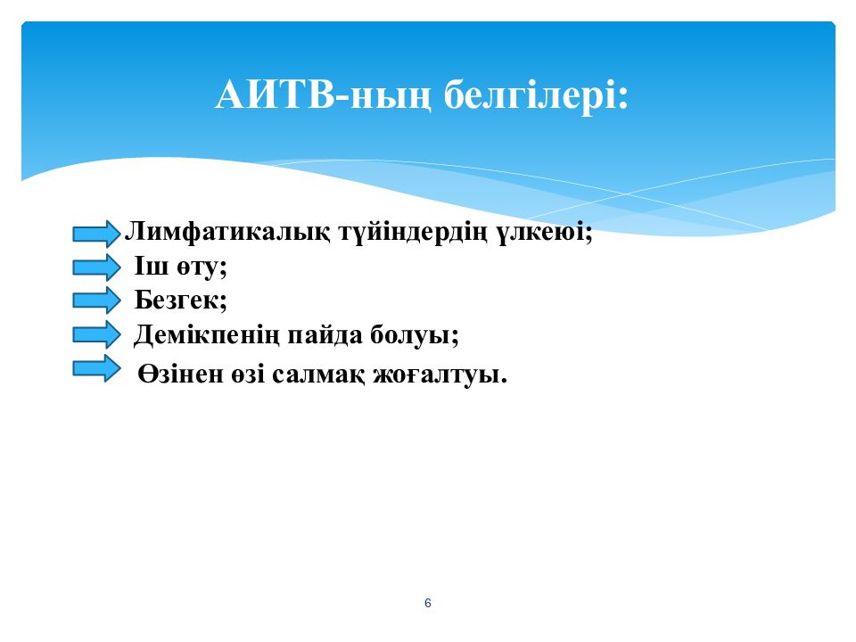 Лимфатикалық түйіндердің үлкеюі; Іш өту; Безгек; Демікпенің пайда болуы; Өзінен өзі салмақ жоғалтуы. 6 АИТВ-ның белгілері: