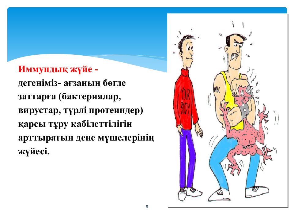 Иммундық жүйе - дегеніміз- ағзаның бөгде заттарға (бактериялар, вирустар, түрлі протеиндер) қарсы тұру қабілеттілігін арттыратын дене мүшелерінің жүйесі. 5