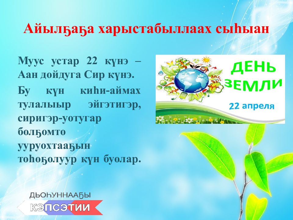 Муус устар 22 күнэ – Аан дойдуга Сир күнэ. Бу күн киһи-аймах тулалыыр эйгэтигэр, сиригэр-уотугар болҕомто ууруохтааҕын тоһоҕолуур күн буолар.